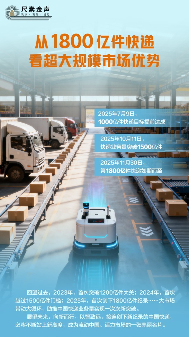回望过去,2023年,首次突破1200亿件大关;2024年,首次越过1500亿件门槛;2025年,首次创下1800亿件纪录……大市场带动大循环,助推中国快递业务量实现一次次新突破。